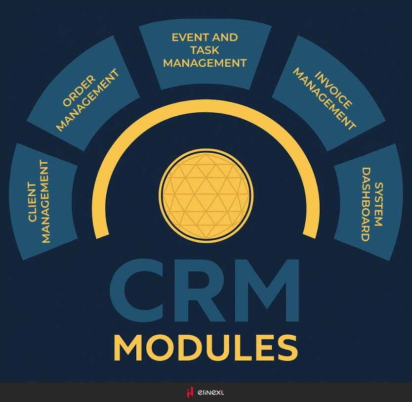 The most popular modules are Sales, Marketing, and Service, however, these can be modified or go under other names, for example: Client Management, Order Management, Invoice Management, Events and Tasks Management, System Dashboard, etc.