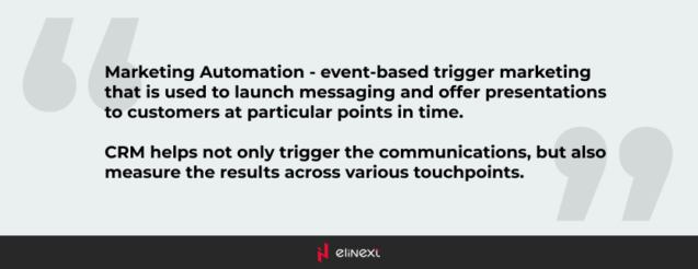 Marketing Automation can be described as event-based trigger marketing that is used to launch messaging and offer presentations to customers at particular points in time. CRM helps not only trigger the communications, but also measure the results across various touchpoints. Below are several examples of automated messages: