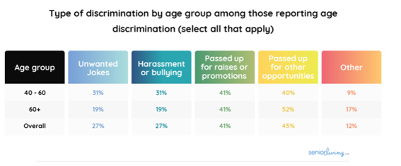 Ageism at the workplace manifests in various ways. However, it stands out that 52% of the respondents over 60 have been passed up for job-related opportunities.