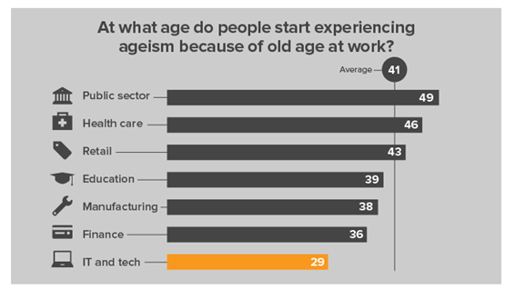 According to a survey sent out by CWJobs, a UK-based tech recruitment website, to 2,000 workers and 250 people who work in the tech and IT sectors, 41% of the IT and tech-sector workers have experienced age discrimination in the workplace. The survey also reveals that only 27% of the workers across the other industries have experienced ageism.
