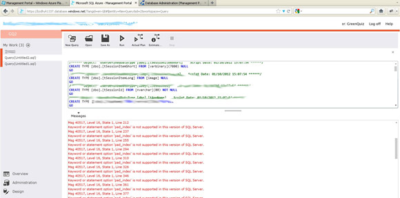 3. Run the script, using Azure Management Portal and get a lot of errors like: