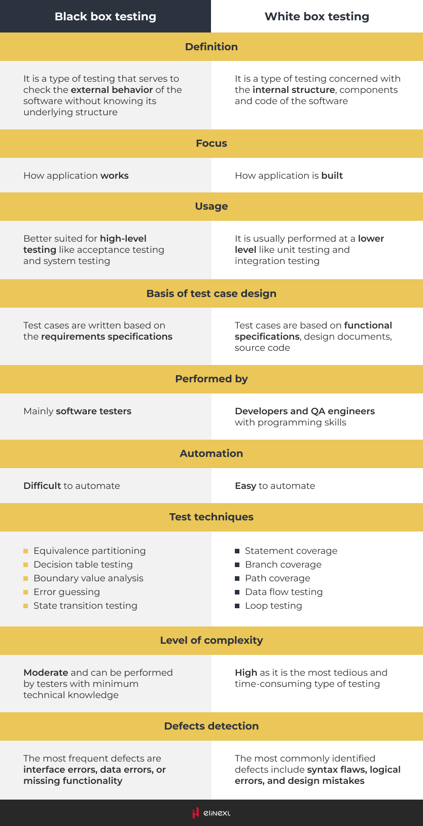 A more important question is how to take the best of both worlds and combine various perspectives. At Elinext, QA engineers work closely with developers to complement black box testing techniques with white box testing strategies to achieve a comprehensive, inside-out inspection of the application.