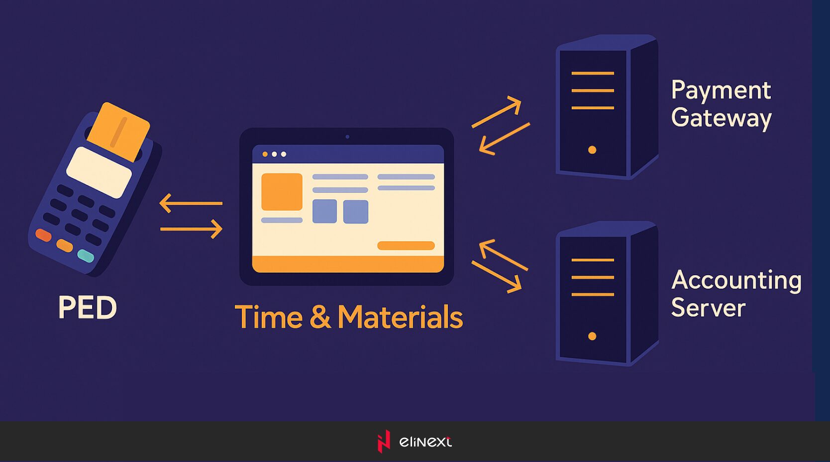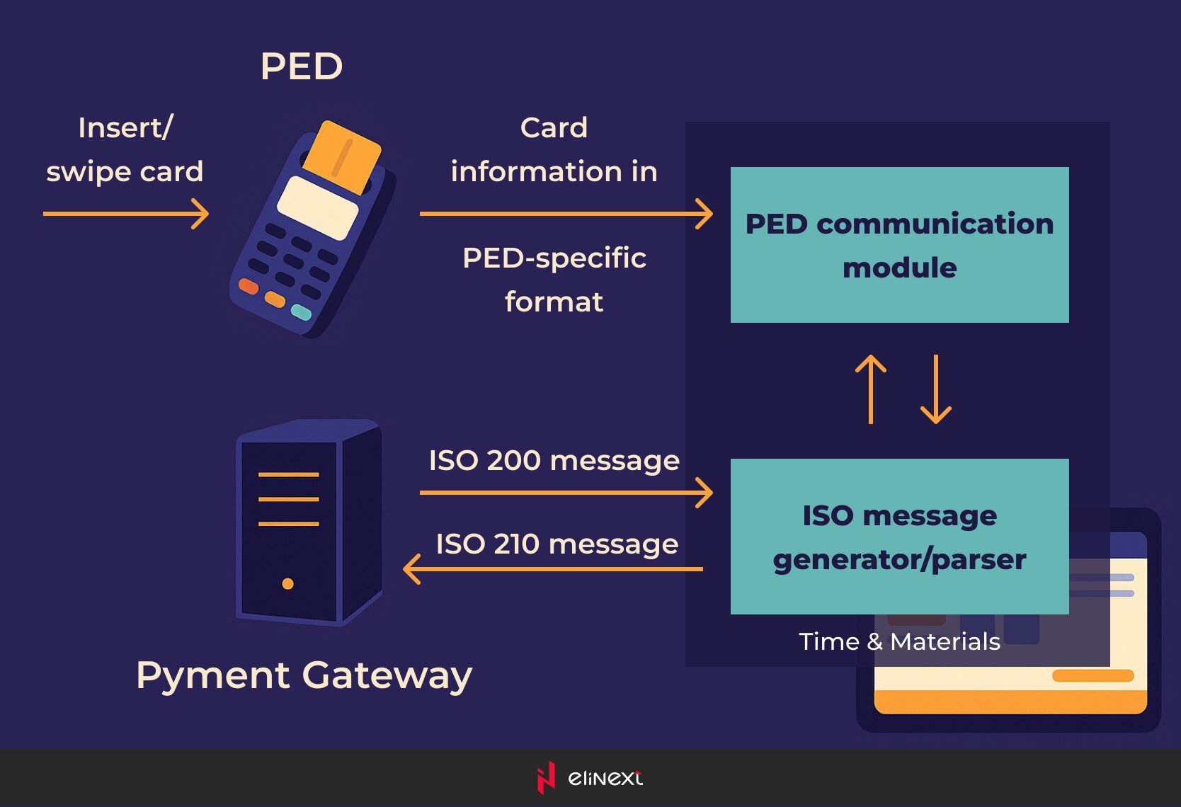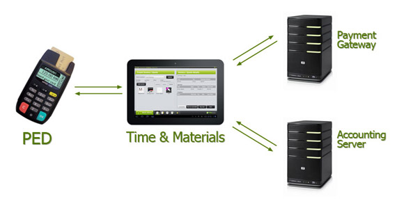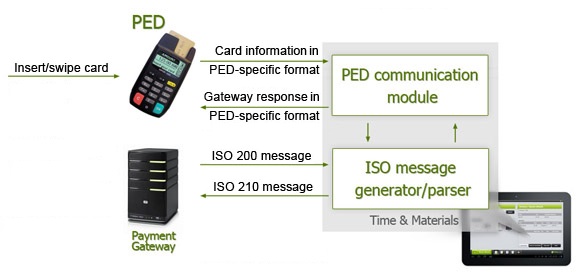 The part of the time and materials application that is responsible for card payment processing acts like an adapter between PED and Payment Gateway, converting the PED messages in a proprietary format to ISO 8583 format that is used by Payment Gateway, and vice versa. The development of a generic PED interface unifies and simplifies new device support and also allows easy PED interchange.