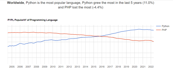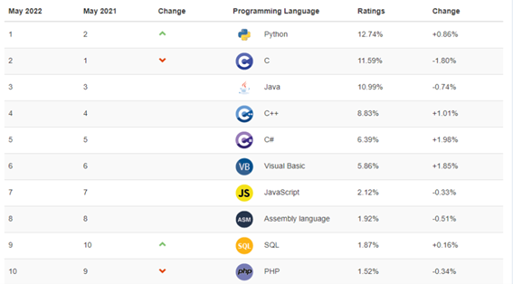 As of May 2022, the TIOBE Index ranks Python as the most popular programming language: