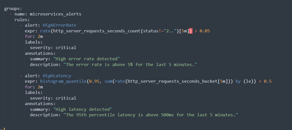 Configure Prometheus to send alerts based on specific conditions. Here’s an example configuration for alerting on high error rates and latency.