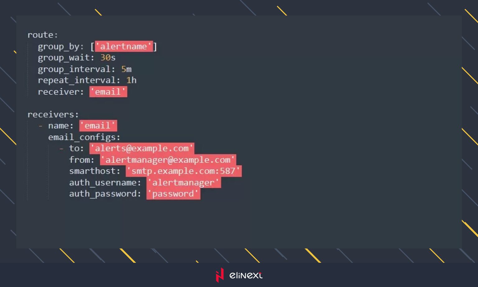 Set up Alertmanager to handle alerts. Create `alertmanager.yml`: