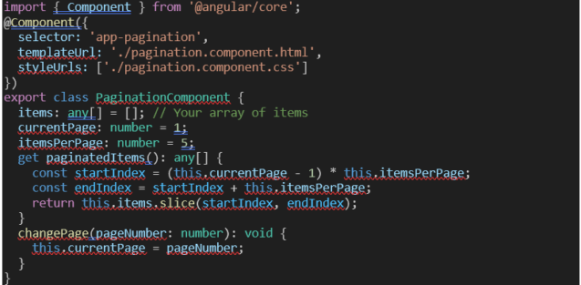 You have successfully set up a fundamental client-side pagination system in Angular by employing an array of items. The PaginationComponent showcases a designated quantity of items on each page, enabling users to seamlessly traverse between pages using the provided pagination controls.