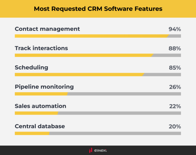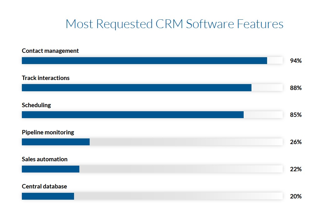 The interdependence between these 3 letters is more than obvious. But what do companies look for when implementing a CRM solution? According to FinancesOnline, managing contacts, tracking interactions, and scheduling are the key features businesses look for in CRM software.