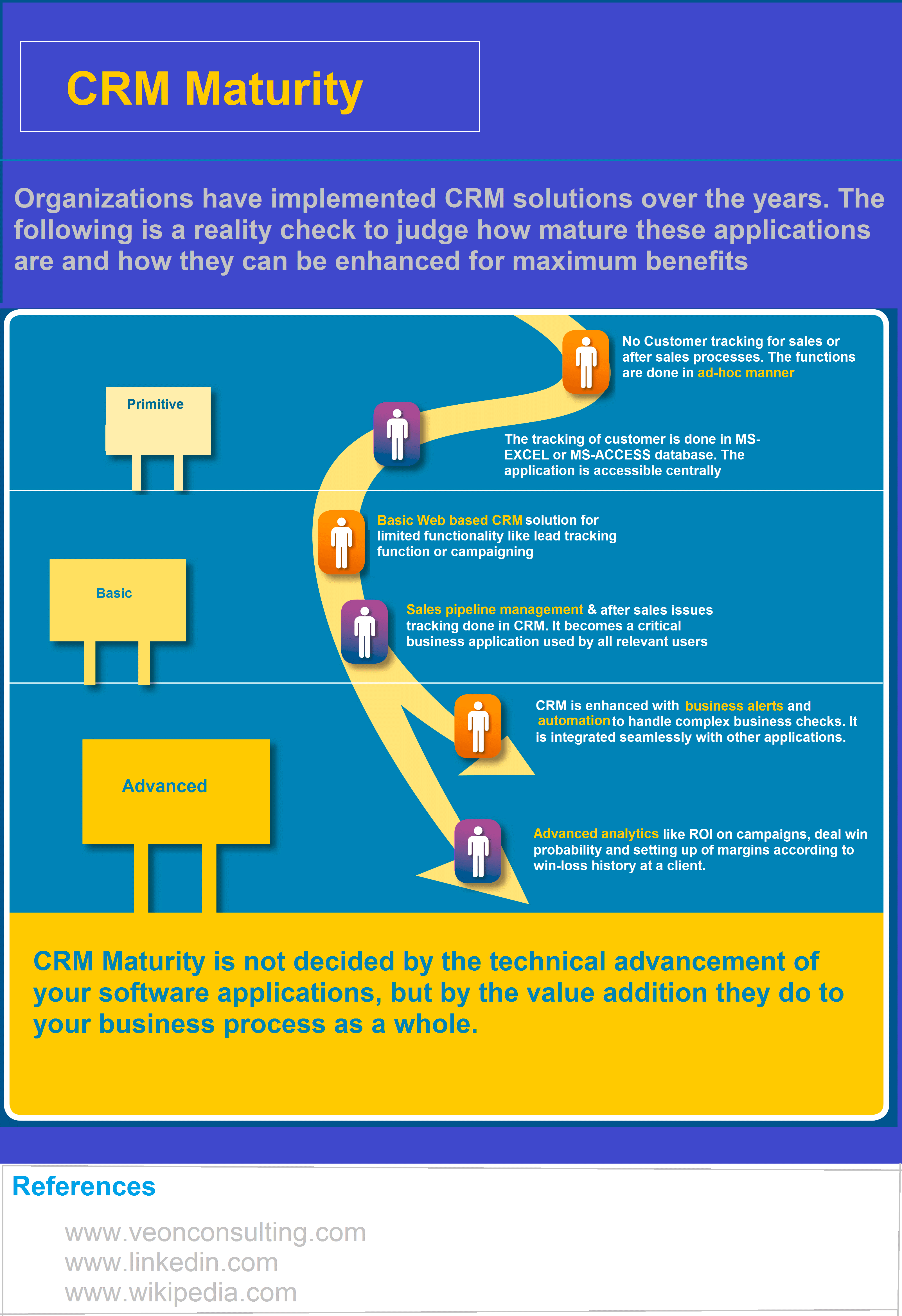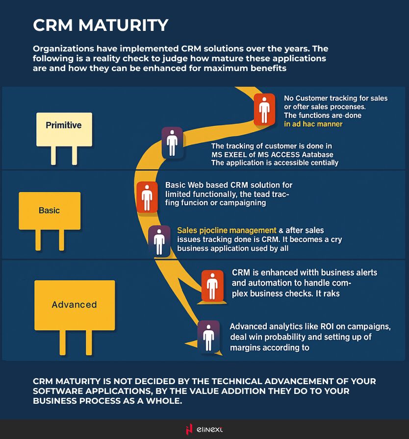 According to Veon Consulting, CRM maturity measures a business’ ability to use effectively all the basic and advanced concepts CRM systems provide. They distinguish 3 different stages: