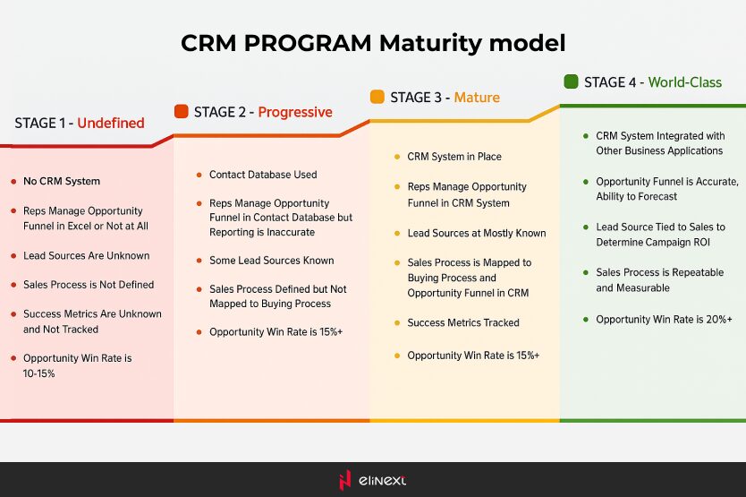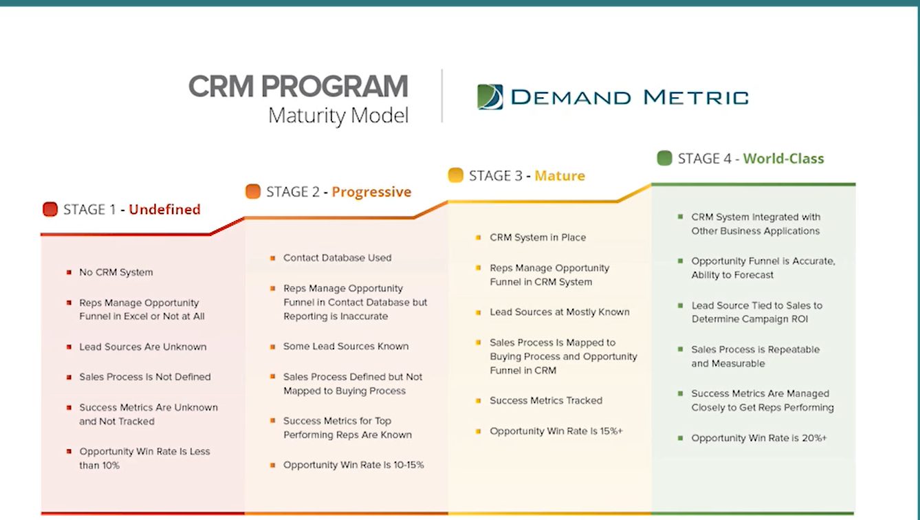 In order to help businesses improve their capabilities and enhance marketing success, Demand Metric has designed a 4-stage CRM Program Maturity Model: