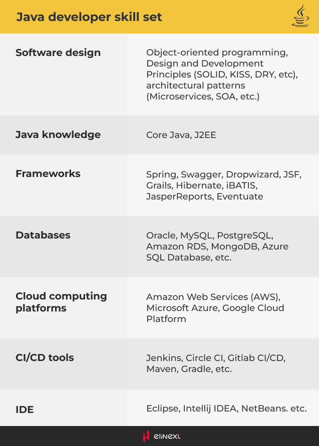 It is a no-brainer that your potential hire must have a solid grasp of the programming language itself (note that as of September 2022, Java 19 is the latest released Java version). However, in the Java environment, strong knowledge of tools, frameworks, and libraries is even more valuable because it significantly accelerates and simplifies the development process. Depending on the project at hand, you may want to examine a developer’s resume for experience with Java EE (Enterprise Edition) components, Spring, Struts, Grail, Hibernate and other ORM frameworks, Java IDE tools like Eclipse, Intellij IDEA, and more.