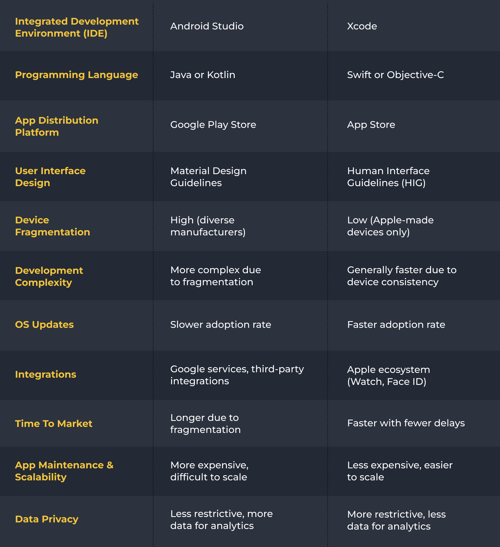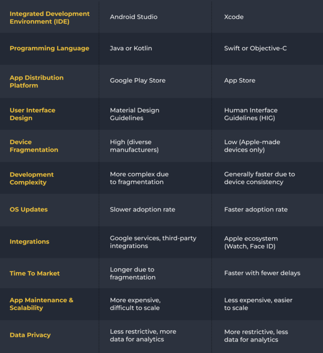 Both Android and iOS are leaders in the mobile world, but they have different approaches to development, especially when considering Android vs iOS development. Let’s take a closer look at the key technical differences that influence how developers work on each platform: