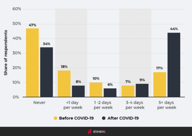 The pandemic has completely changed not only how we live but also how — and where — we work. Now, working from home (WFH) has become the predominant model as social distancing and lockdowns made working in an office close to impossible. In the US alone, the number of employees who work from home 5 days per week or more increased up to 44%.