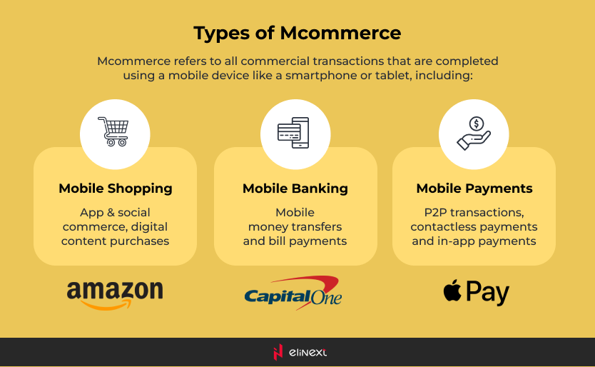 Retail software development services enable three main types of mobile commerce: mobile shopping (purchases through apps like Amazon), mobile banking (financial management through apps like Chase), and mobile payments (using wallets like Apple Pay). For example, the Walmart app integrates shopping and payments, and the PayPal app enables secure mobile transactions.