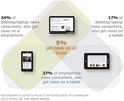 Getting back to the US market, the majority of Americans nowadays consume news through at least one digital web-enabled device. According to the research ‘The State of the News Media 2012’ by the Pew Research Center’s Project for Excellence in Journalism, nearly a quarter of U.S. adults, 23%, get news on at least two devices a desktop/laptop computer and smartphone, a computer and a tablet, a tablet and a smartphone, or on all three.