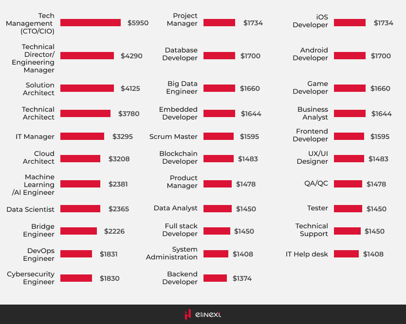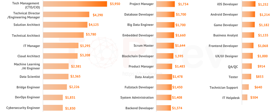 Сompare the salaries of Vietnamese engineers with those of their colleagues from other in-demand IT outsourcing destinations, say, from Malaysia (1,036 USD per month), and you’ll see Vietnam wins again in terms of people-related costs.