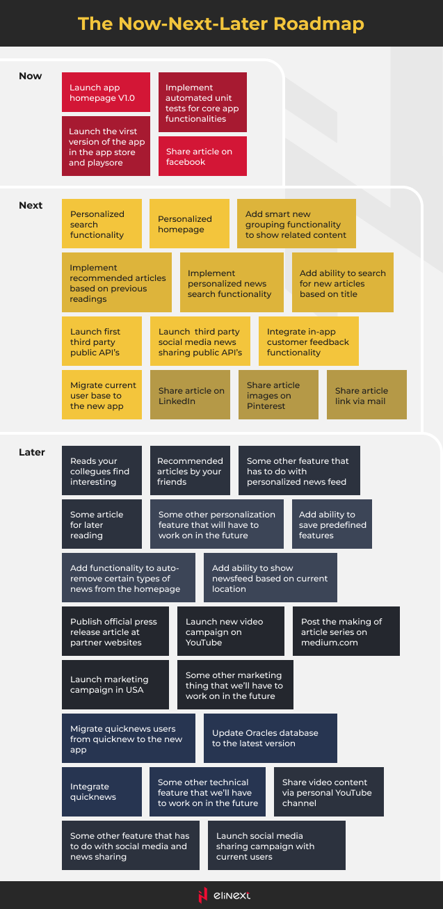 - A now-then-later roadmap that describes tasks or features in a prioritized manner;