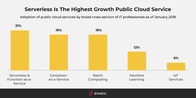 In 2018, the RightScale cloud report was published with respondents among specialists from a wide range of organizations on their implementation of cloud infrastructure (997 respondents range from technical executives to managers and practitioners). Serverless is indicated to show the highest growth among public cloud services: