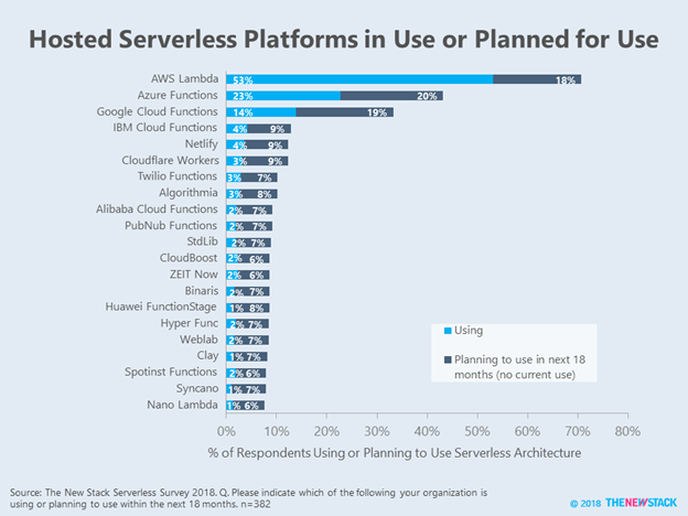Ever since the first success of AWS Lamda, the serverless market has been evolving with new advanced platforms and frameworks coming up. However, AWS Lambda still holds the largest market share favored by as much as 53% of organizations. The top 5 platforms also include Azure Functions, Google Cloud Functions, IBM Functions, and Netlify.