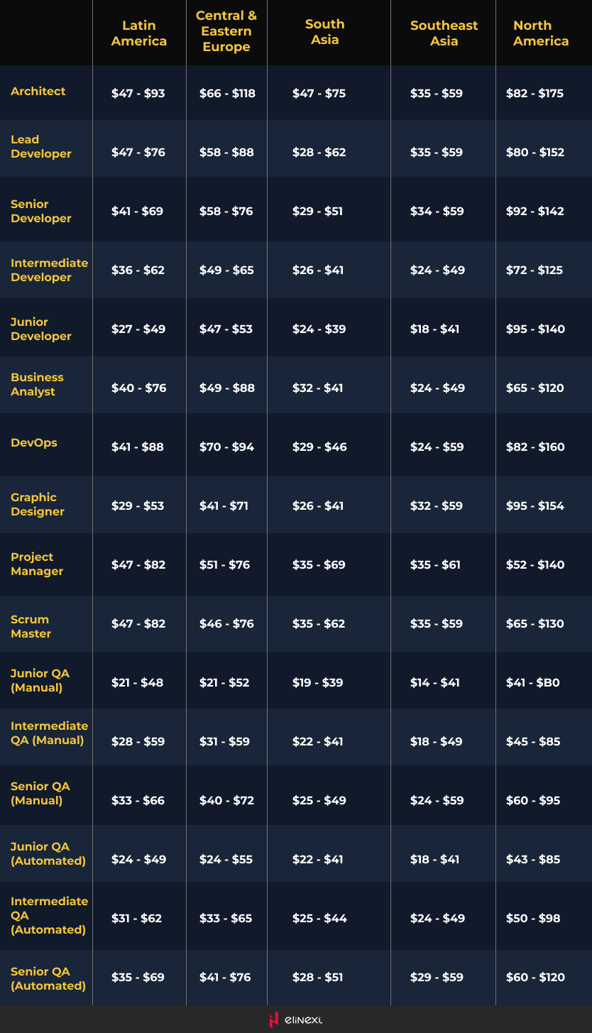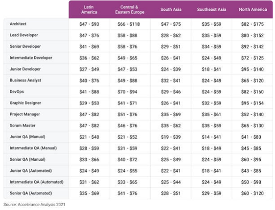 There are many factors that influence software development rates: location, talent pool, business environment, local regulations, etc. Accelerance breaks down rates depending on region and skills: