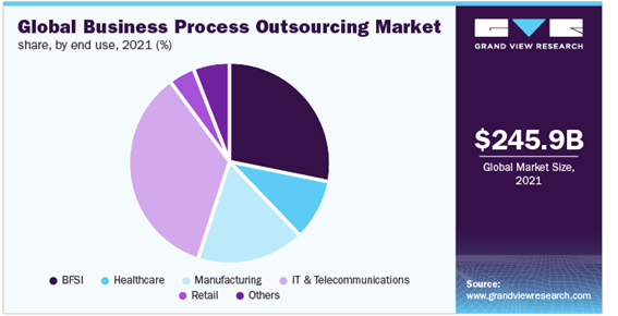 Globally, in 2021, the business process outsourcing market was evaluated at $245.9 billion and is expected to keep growing at a CAGR of 9.1% by 2030. According to Gran View Research, the IT & telecommunication segment accounted for no less than 34.0% of the overall market: