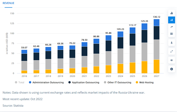 In 2022, the revenue in the IT Outsourcing Asian segment is expected to reach US$86.86bn and grow at a CAGR of 9.40% between 2022 and 2027, reaching US$136.10bn by 2027.