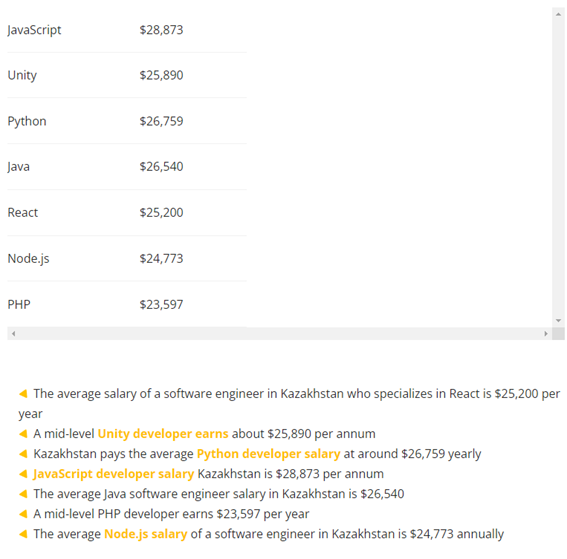 According to Qubit Labs, these are the average salaries of Kazakh software engineers by technology: