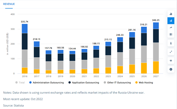 The same year, the IT outsourcing market in Asia-Pacific reached $214 billion. According to Straits Research, by 2030, Asia-Pacific is expected to hold the largest market share, reaching $349 billion and growing at a CAGR of 6%. By 2027, the European IT outsourcing market is expected to grow at a CAGR of 8.06%, reaching a market volume of $186.40bn.