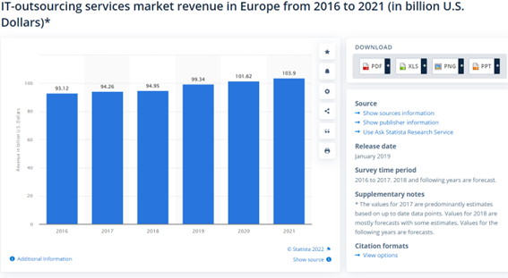 Considering these growth trends, it would be interesting to take a glance in the future and see how the European and Asian outsourcing markets are expected to evolve. In 2021, the European IT-outsourcing market reached $103.9 billion: