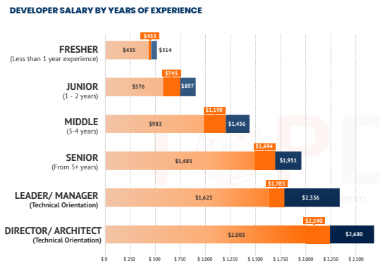 The numbers are there — in 2024, the average salary for a software developer in Vietnam is 15,800,000 VND (approx $640 USD), far lower compared with the average salary of their colleagues from other popular IT outsourcing locations such as China (approx $4,000 USD) or Malaysia ( $1,040 USD).