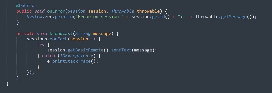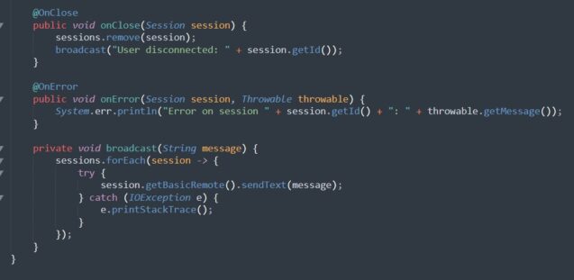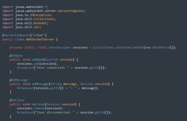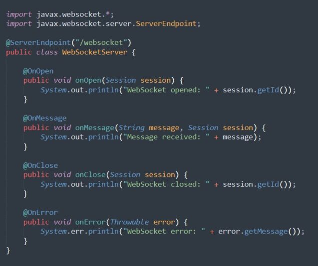 In this server implementation, we define a WebSocket endpoint `/websocket` and annotate methods to handle various WebSocket events such as opening, receiving messages, closing, and error handling.