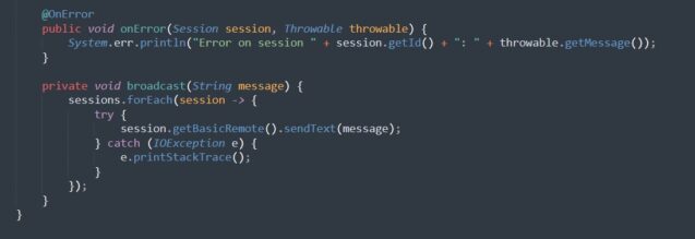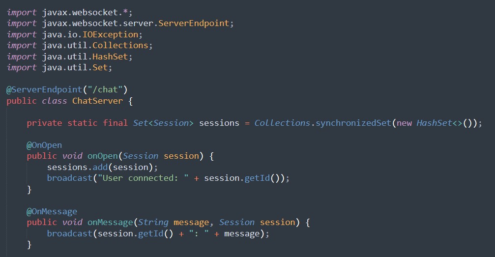 These examples showcase more advanced WebSocket usage in Java, enabling real-time communication in a chat application scenario.