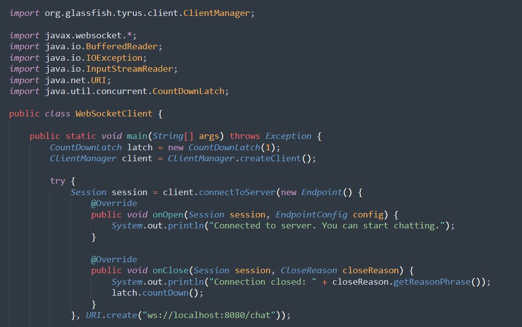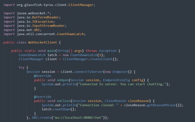Let’s delve into a basic example of setting up a WebSocket server and client using the Tyrus library.