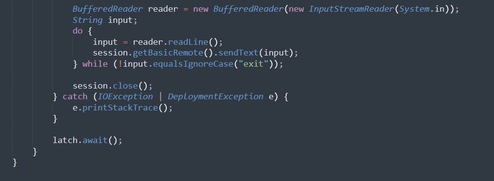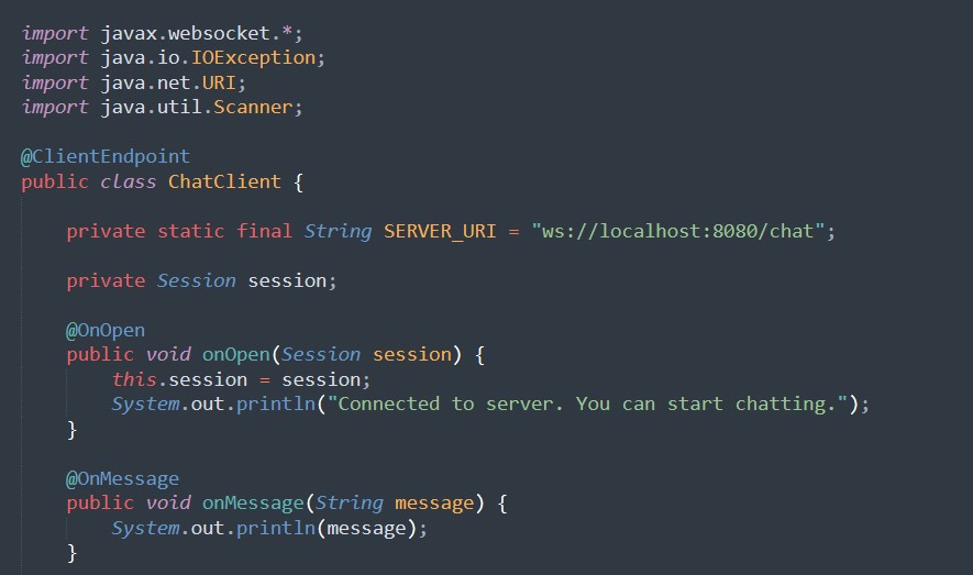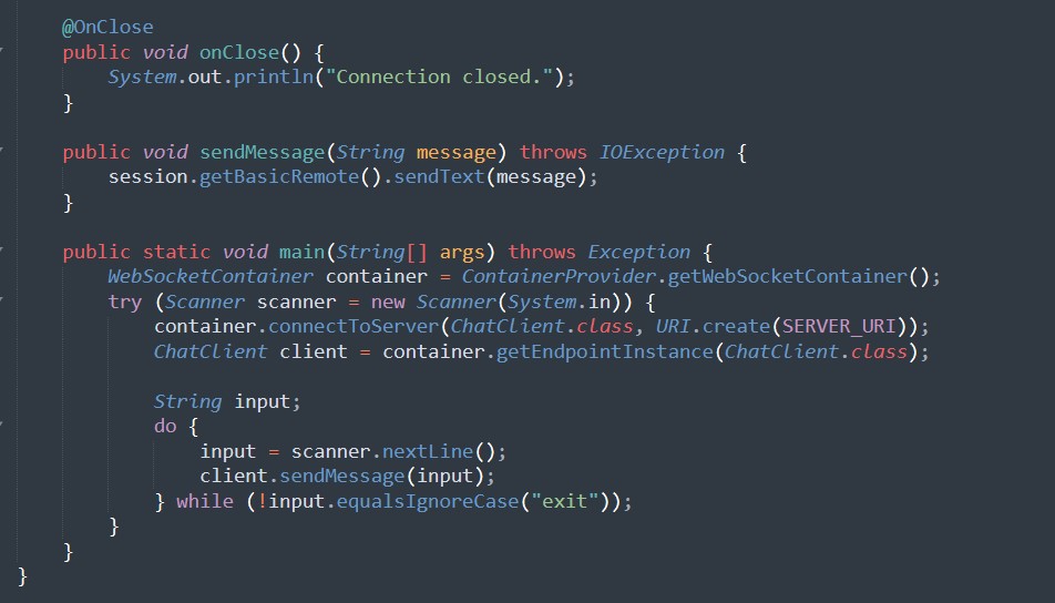 The WebSocket client (`WebSocketClient`) connects to the server and allows users to send messages to the chat room. It closes the connection when the user types “exit”.