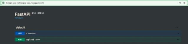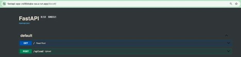 After finishing the deployment, let’s visit the generated service by providing the URL from the previous step. FastAPI has a built-in integration with Swagger, which is a powerful tool for API documentation. Swagger provides an ability to test API endpoints directly from the documentation interface and helps in quickly identifying and fixing issues during development. The home page is shown in the figure: