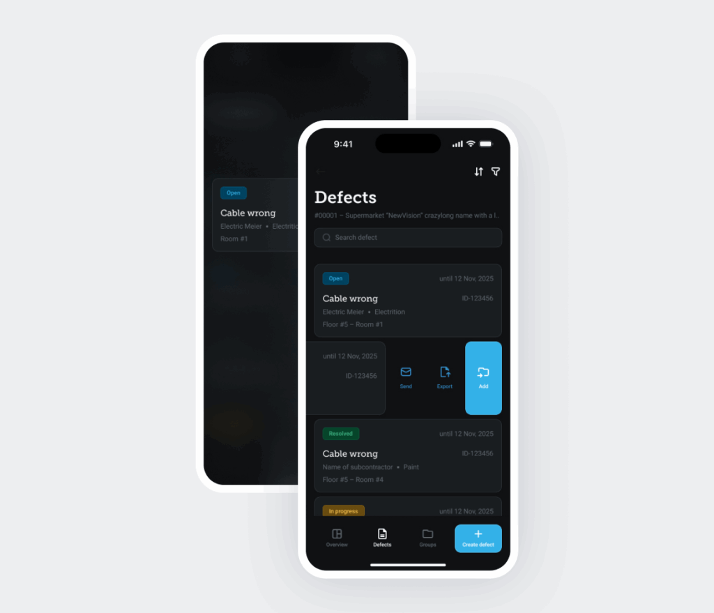 The app enables field users to securely sign in, access project lists with overview statistics, and quickly identify priority projects through favorites. Defects can be created, edited, and managed directly on site, including photos, location data with map pins, status, trade, and subcontractor information. Defects are organized into structured groups and can be exported or shared as documents, supporting clear communication between field teams and office stakeholders.