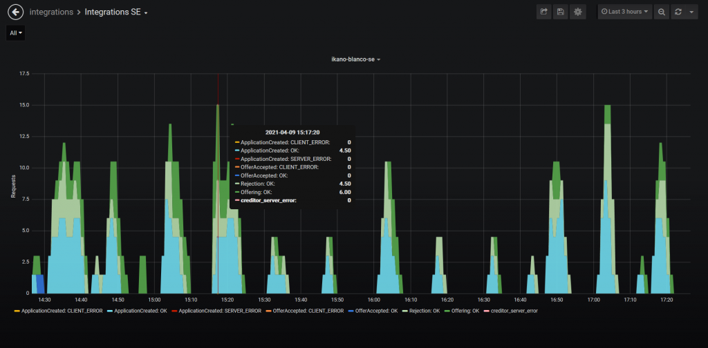 We developed a statistics board for admins, which shows figures like how many loan applications are in progress, accepted or rejected, how many requests resulted in an error, and more. We used Prometheus to source the metrics and Grafana to visualize them.