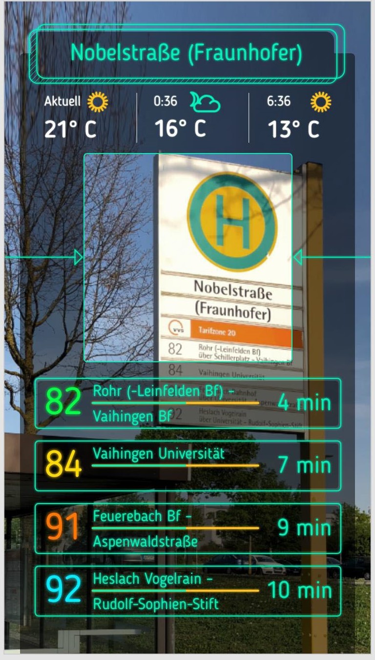 Our application visually “follows” the camera in a smartphone. Then it determines which transport stop a user has directed his camera at. Finally, the app shows the current transport schedule and an estimated transport arrival time for this particular stop.