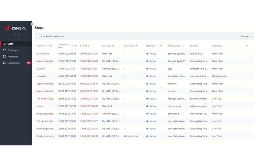 A user with sufficient access rights can create a new template, either from scratch or based on another one. This is usually done to describe a process as a sequence of steps that is consistent with other processes. Users can also manage Templates, make them unavailable and initiate Processes.
