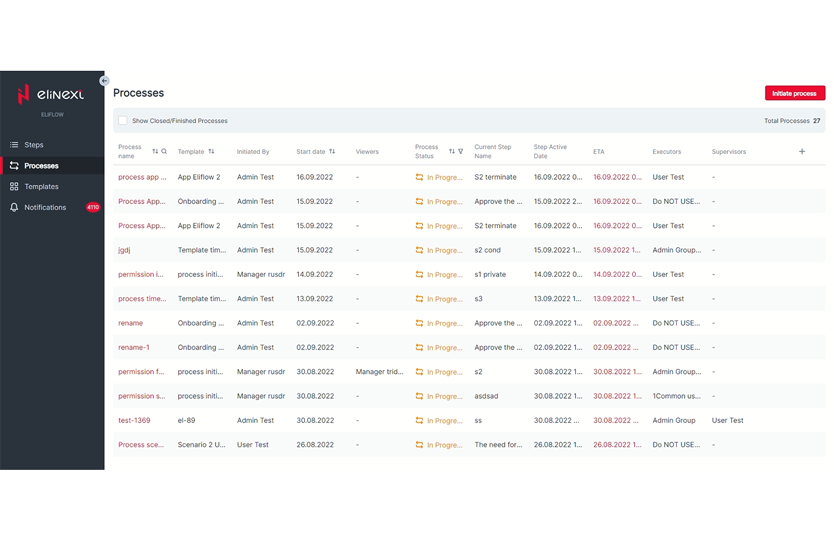 Permissioned users go to this page to initiate, manage and monitor Processes. A Process Initiator can edit its details, put it on hold, complete or close it. For greater transparency, they can view Process logs at each step in detail.
