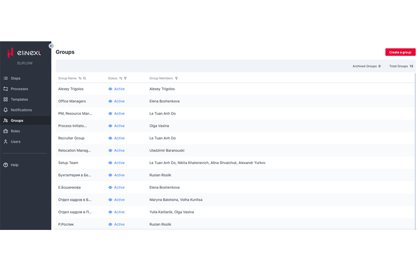 A Group represents a set of users that can be assigned different roles. All Groups are featured on the same page with details like a group name, its status and members. Users with relevant access can create, view, archive/unarchive and delete Groups.