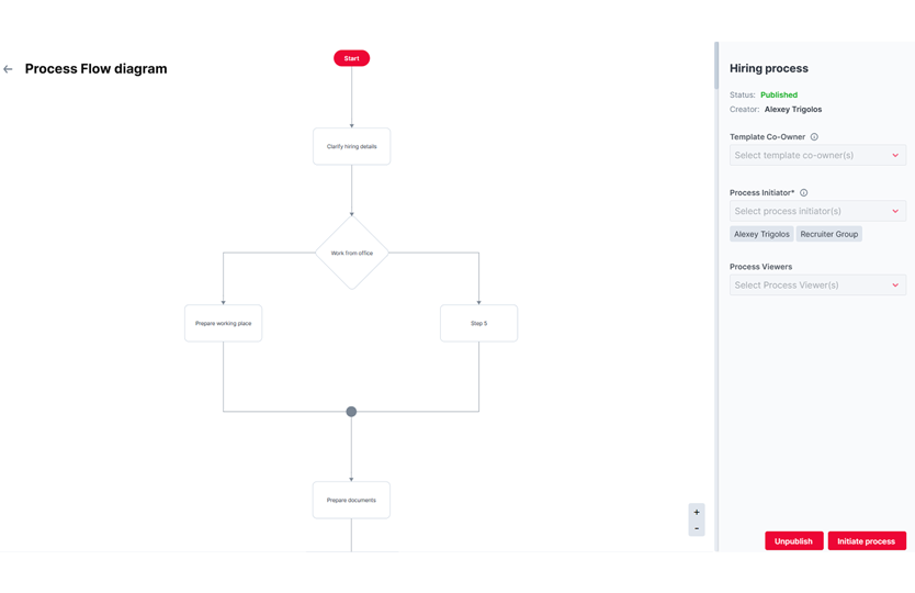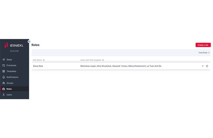 A user can be assigned a Role: Process Initiator, Process Viewer or Step Executor. Each of the Roles comes with its set of permissions for actions with Templates, Processes, Steps, Groups and Roles.