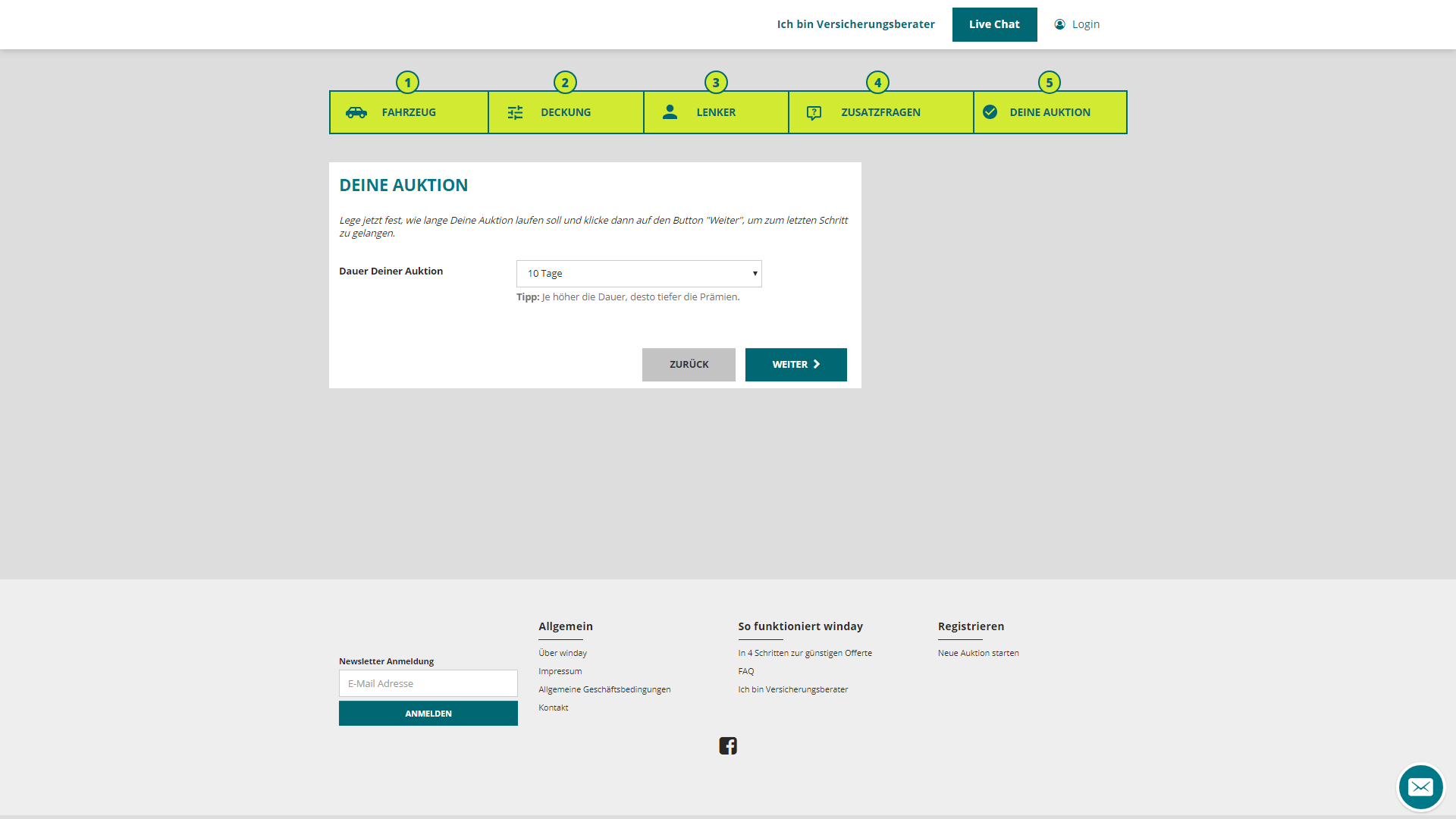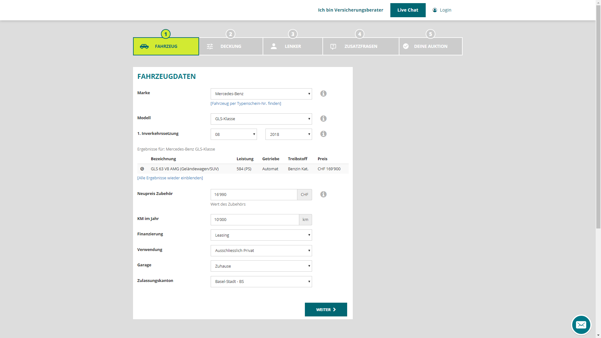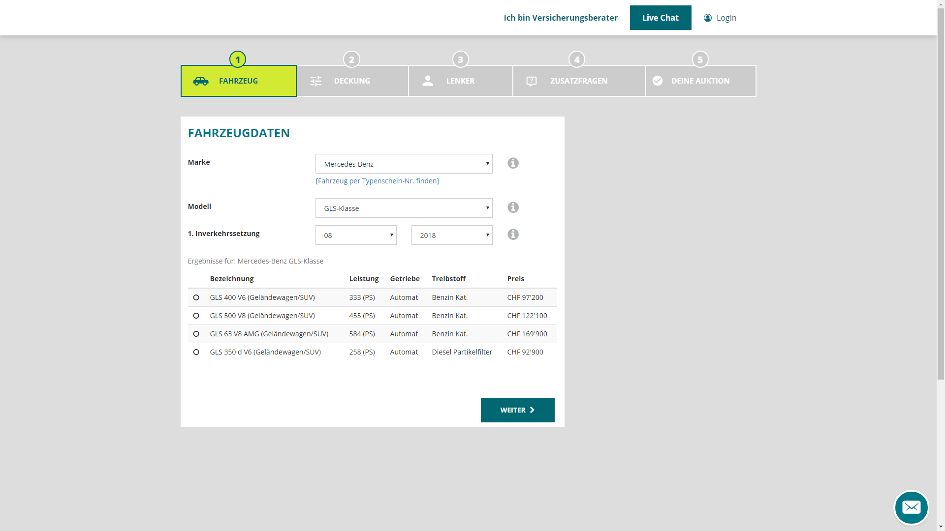 The customer collects his vehicle data, states the desired insurance coverage, and starts an auction. All vehicle and insurance data is already pre-recorded and available in a drop-down list, so the input doesn't take a lot of time.
