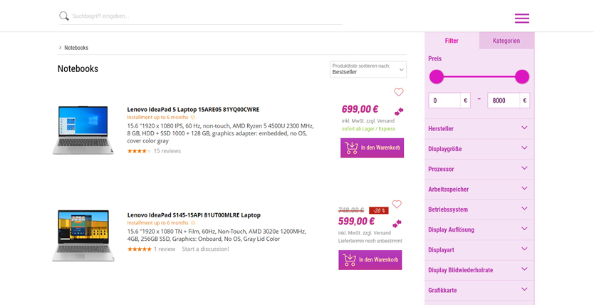 The sheer variety of notebooks and similar technical products for sale, each defined by a range of technical parameters, often spells choice paralysis for shoppers and stops them from buying. To help remove that block, the client requested us to develop a comparison page.
