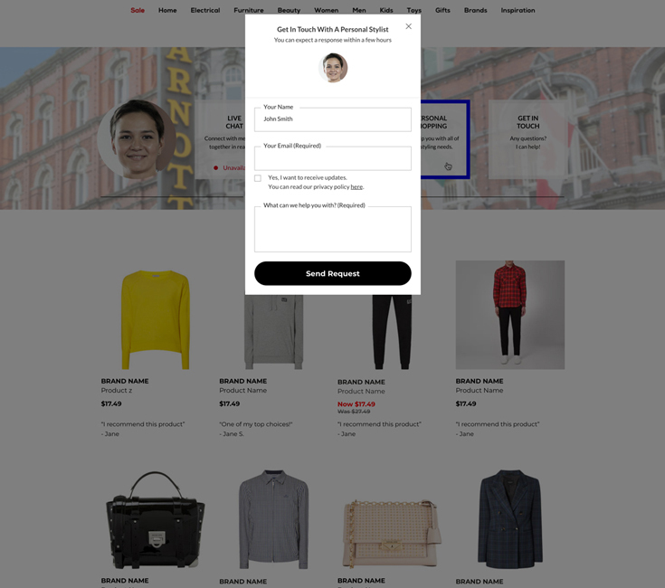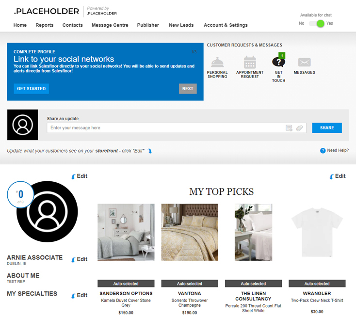 A retailer might have stores in different cities. If so, it can create location-based profiles of its store associates, featuring the products available in those locations. The system will automatically detect where a website visitor is from and link them with the right associate.