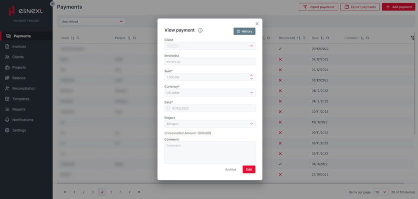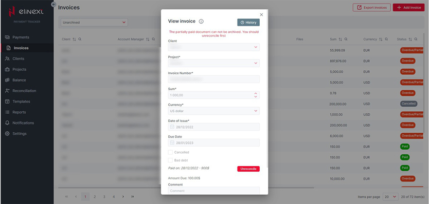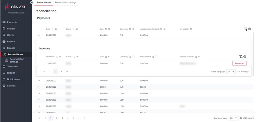 On the Reconciliation page, the user is allowed to manually correlate payments with invoices, which allows updating data on the amount of the client’s debt to the company. The system automatically offers invoices to which a particular payment potentially applies.