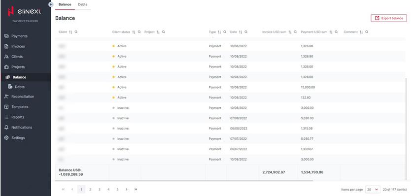 On the Balances page, the user can observe all the payments and invoices, it is possible to see the summary amounts automatically recalculated in USD. The user can filter the Balance by the client, its status, project, entry type, date, and sums and export a balance as an Excel report.