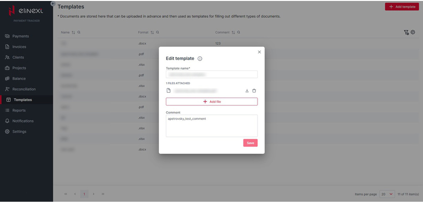Templates. It is possible to upload, and store in the system the various document templates. The user can download document templates anytime.