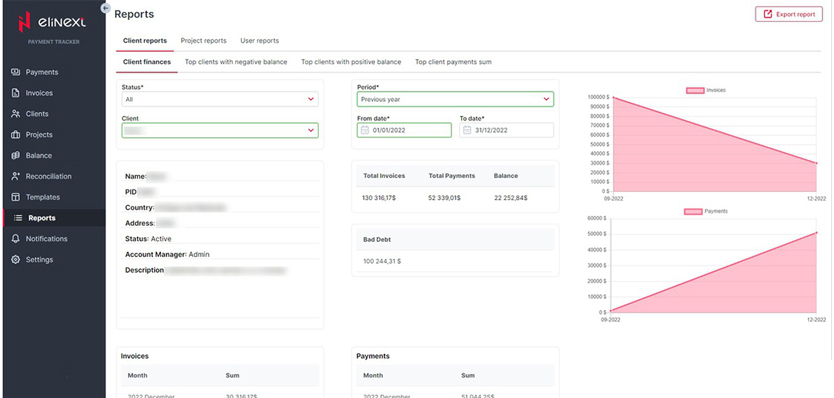This module also includes the Debts page. That way, the user can easily observe all the invoices that are not fully paid, also it is possible to see the summary amounts automatically recalculated in USD. The user can filter the grid by the client, its status, project, due date, sums, and comments, and then export a balance as an Excel report. This is the fastest way to see the amount of accounts receivable.