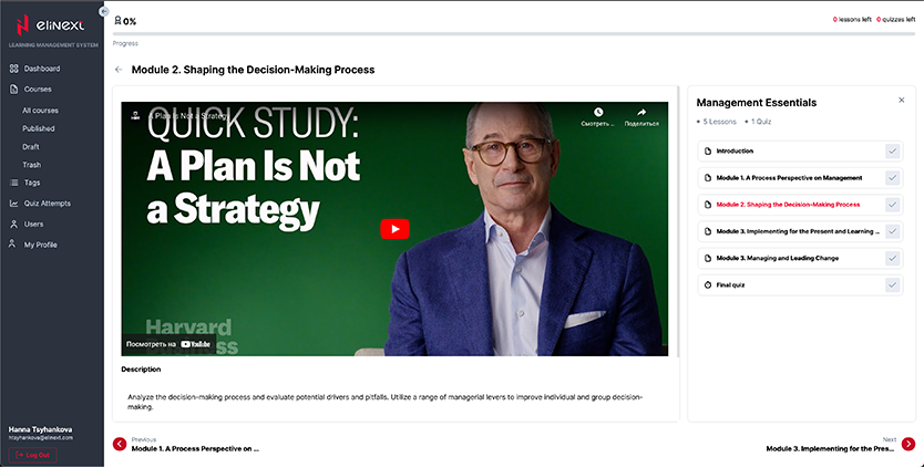 Elinext as a company lacked a suitable tool for delivering efficient and seamless learning experiences to its employees. While we were using Udemy, Coursera, and other learning platforms, for many reasons, it would be beneficial to have our own learning platform.
